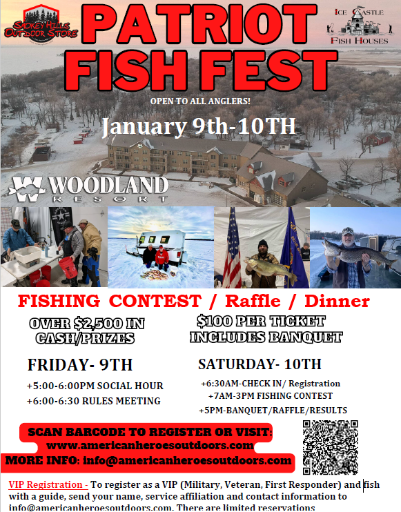 Join us in honoring our nation’s heroes on January 9th and 10th, 2026. Patriot Fish Fest, presented by Smokey Hills Outdoor Store and Ice Castle Fish Houses, at Devils Lake, ND, is open to the public.